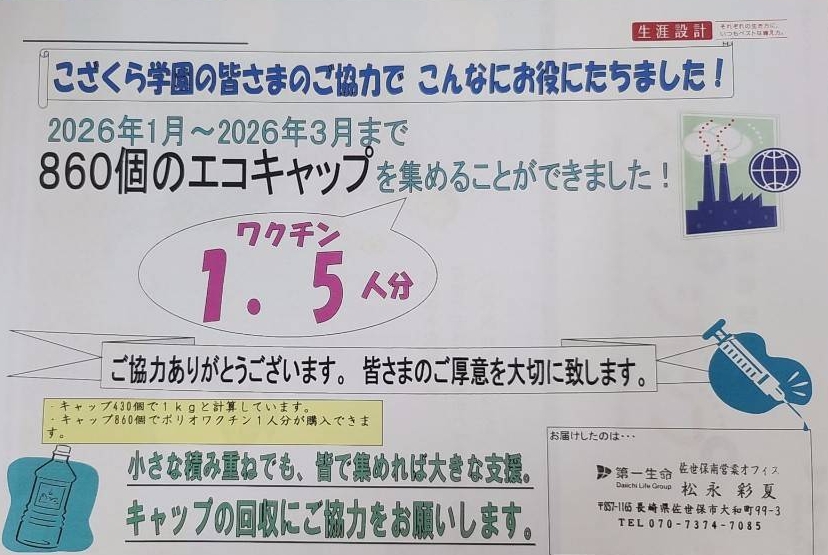 集まったキャップは合計860個(ワクチン1.5人分)。第一生命様を通じて、回収していただきました。